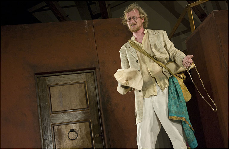 Jiří Sedláček (Dromio syrakuský), v pozadí Petr Sýkora (Antifolus syrakuský), zdroj: © PaS de Théâtre, foto: Radovan Šťastný